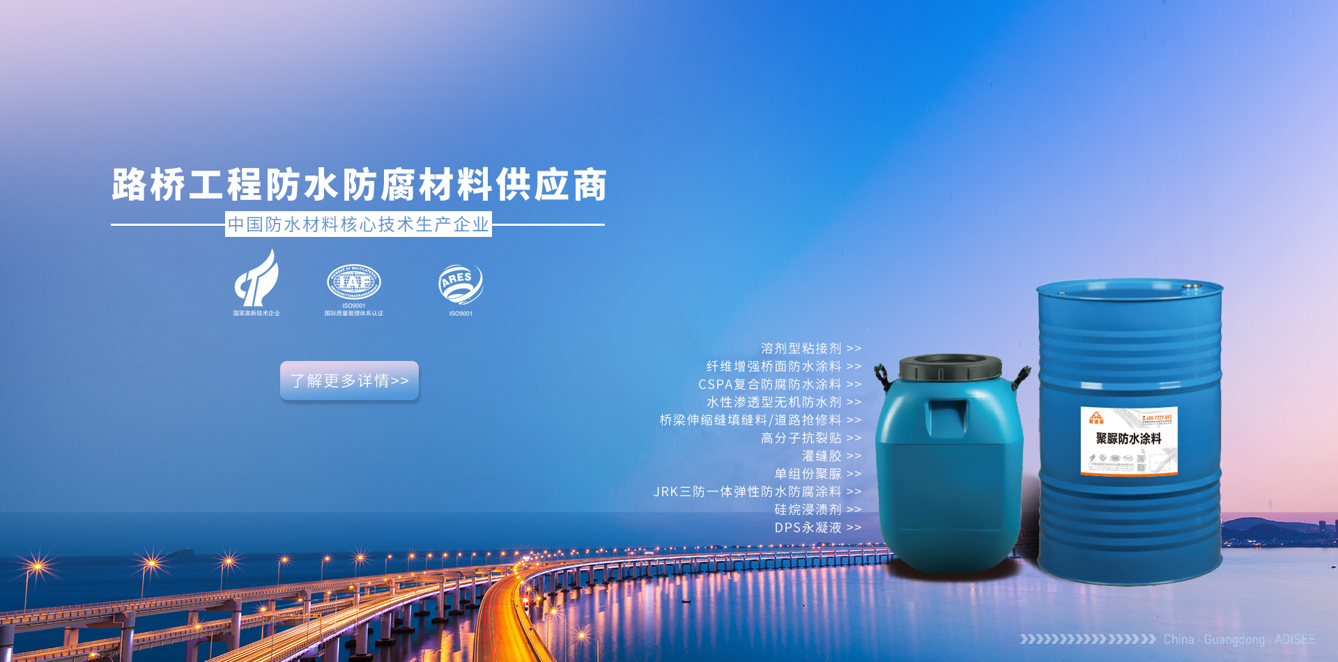 廣東愛迪斯新型材料科技有限公司廣州分公司 隔音隔熱系列 路橋及防腐防水系列 家裝工程防水系列 修繕補漏防水系列專業承接路橋防水防腐工程施工及防水材料銷售,路橋防水工程遍布全國各地,多年的技術經驗積累了一整套橋面防水病害處理方案,專業的路橋防水技術,配套路橋防水施工設備,圓滿完成路橋防水施工任務,用戶滿意度評價高,處橋梁防水行業技術領先水...